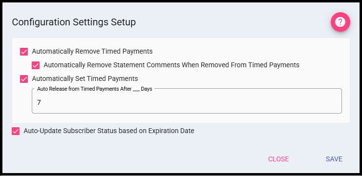 Automatically Remove Statement Comments When Removed From Timed Payments: Automatically removes the Statement Comments in the Account/Sub module's Other Tab when the account is automatically removed from the timed payments process. This setting requires Automatically Remove Timed Payments to be enabled in order to work.