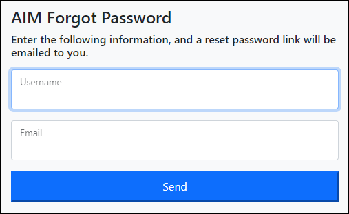 Forgot Password: Allows a user to request a new, temporary password. This reset can only proceed with a match of the username and the email established in the User Maintenance Setup. User will be prompted to change their password on their initial login once they complete the forgot password process.
