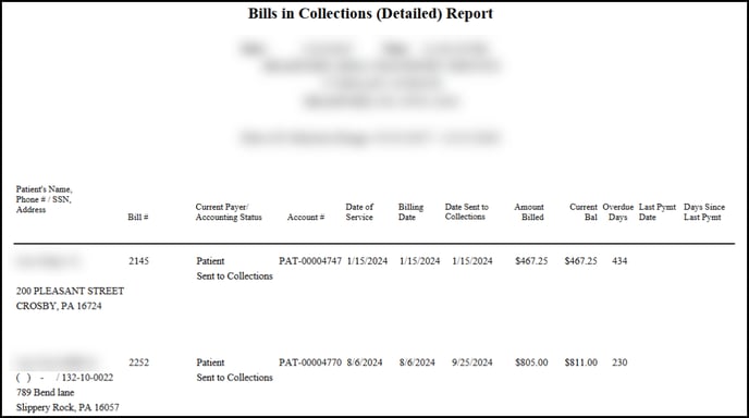 The output of the report provides many details for each bill. The first column contains the Patient Name, Phone Number, SSN and Address Information, followed by the Patient Date of Birth, if configured to display. The next columns provide the Bill Number, the Current Payer and its Accounting Status, the Patient Account Number, Date of Service, Billing Date (the date the bill was first sent), Date Sent to Collections, Amount Billed, Current Balance, Number of Days Overdue, the Last Payment Date, and the Number of Days Since Last Payment.
