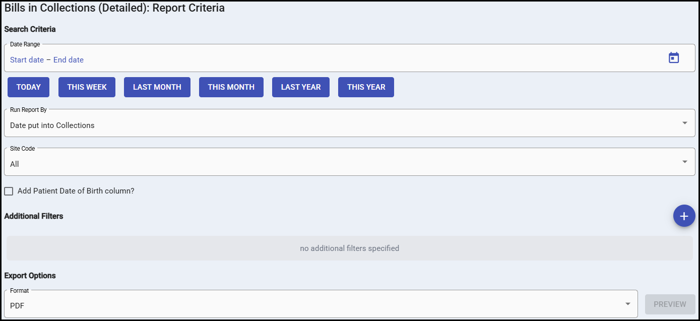 - Date put into Collections: runs the report over a transaction date range, identifying bills that entered the collections process within that timeframe using the SL (Sent to Collections) transaction.