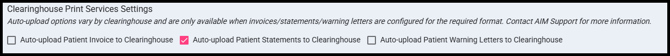 Before enabling any of these settings, you must confirm the clearinghouse is prepared to receive your automated uploads. Contact AIM Support for more information.