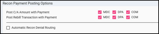 Post C/A Amount with Payment: If checked, will automatically post the C/A for the checked payer types when a Recon payment is posted.