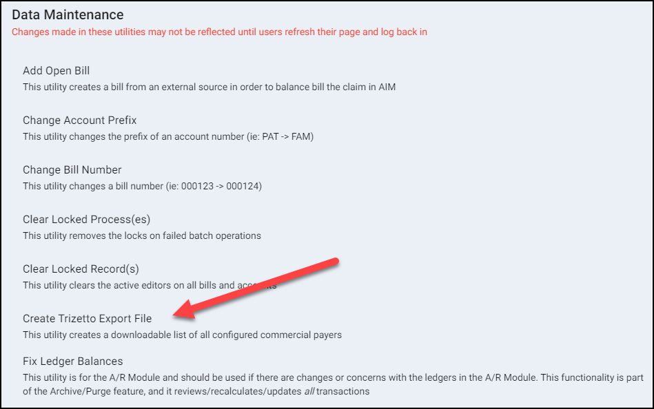 Within the Data Maintenance window, select the option: Create Trizetto Export File.