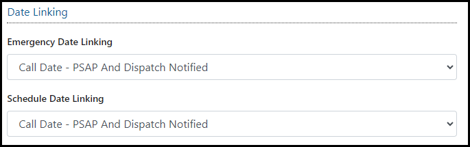 Date Linking links the data entered in the Call Date Field to PSAP (Public Safety Answering Point) and/or the Dispatch Notified Fields to avoid ongoing repetitive data entry, when these fields are expected to be the same.