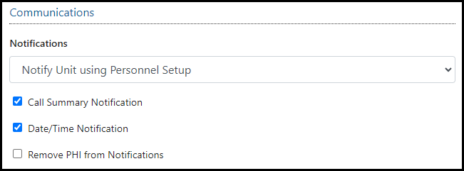 When Remove PHI from Notifications is selected, in conjunction with “Enable PCR Notifications”, the patient name will be omitted form the notification text/e-mail triggered by entering a “Unit Notified By Dispatch Date/Time” on an assigned Dispatch Call.