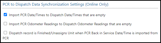 When Dispatch record is Finished/Unassigns Unit when PCR Back in Service Date/Time is imported from PCR is selected, any Dispatch record that has a Black in Service Date/Time field imported form PCR will automatically be Finished and the unit un-assigned.