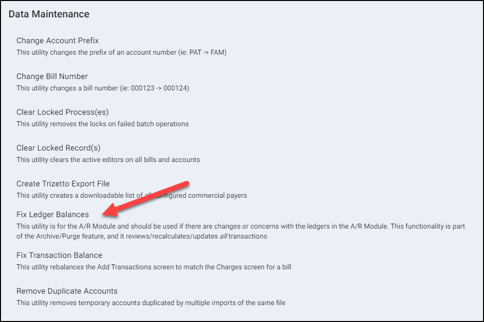 Fix Ledger Balance concerns issues in the A/R Module, usually with purges or transaction corrections. Fix Transaction Balances concerns a specific situation where a specific bill number has an incorrect posting screen balance.