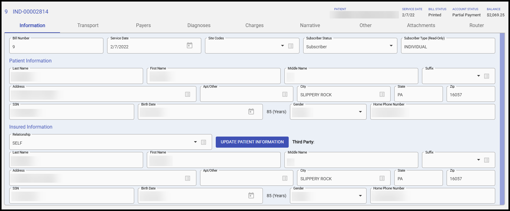 The Information tab is broken into three sections: General Bill Information, Patient Information Section and Insured Information Section.
