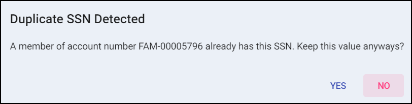 If a Social Security Number (SSN) is entered that already exist in an Account, a prompt will be displayed before data entry continues.