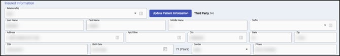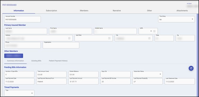 The Account Information Tab houses the patients' demographic information, utilized in future bills and statements.
