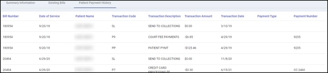 Billers can quickly ascertain details specific to patient-related transactions in the Patient Payment History tab. Clicking this section will open a new grid showing the following transactions posted to patient bills: