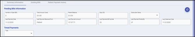 This area provides reference information, especially when talking to a patient or Insurance Company about various bills in the account.