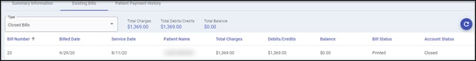 Click the Existing Bills Tab to see details of Open, Closed, and Non-Printed/Rejected Bills. Details can be changed using the Type dropdown and the latest data can be viewed by clicking the refresh button on the right. Grand totals will also be present to the right of the Type dropdown. Click any Bill Number to be directed to that bill in the Billing Module.