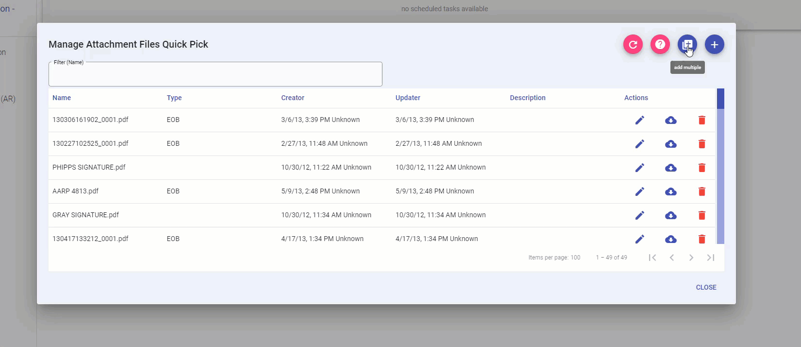 Note: When one or more files are selected via checkboxes, the Edit, Download, and Delete buttons are disabled for individual files. These buttons re-enable when all checkboxes are unchecked.