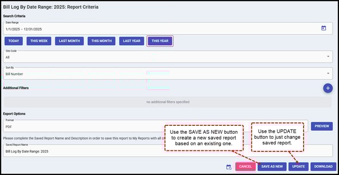 - DOWNLOAD: Downloads the saved report with the saved criteria settings.