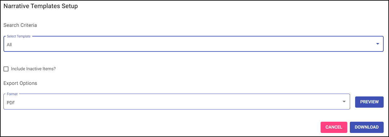 This report lists Narrative Templates configured in the Narrative Template Setup.