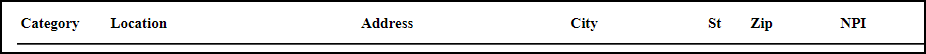 Report displays Category, Location, Address, City, St, Zip, and NPI. It is grouped by Location Category.