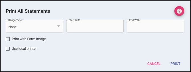 - Account Number: print statements for Account Numbers defined by the start and end fields.