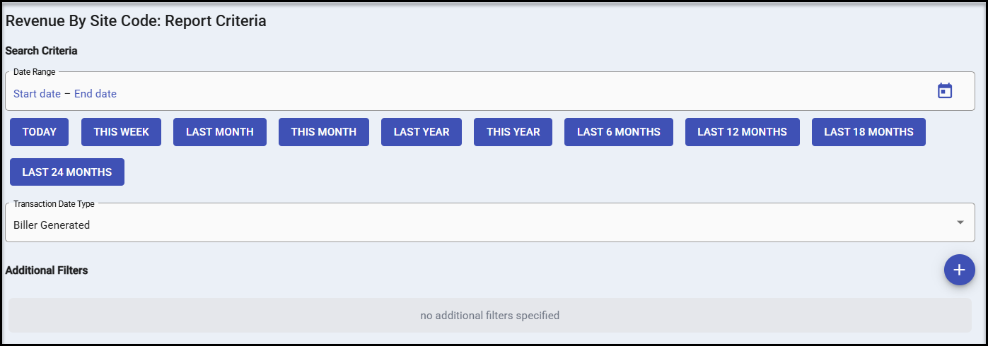 To run this report or queue, simply select a date range and choose whether to run based on the date entered by the biller at the time of the transaction posting (Biller Generated Date Type) or the actual date/time of transaction posting (System Generated Date Type).