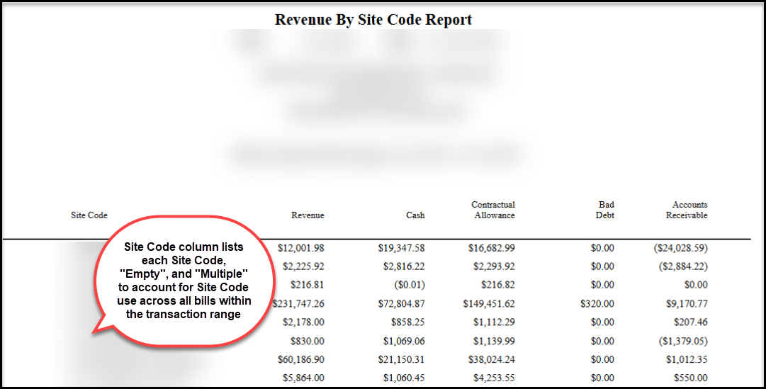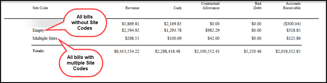 The report output will display a row for each site code along with a row accounting for Empty (accounts for all bills without Site Codes) and Multiple (accounts for all bills with more than one Site Code). Users can then view ledger balances for each Site Code using the columns, or view totals for cross-referencing purposes at the bottom of the report. These totals do not display on the Queue version.