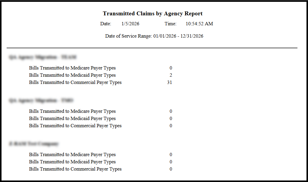 The Transmitted Claims by Agency Report provides a comprehensive view of claim transmission activity across multiple agencies within a specified date range. This report breaks down transmission counts by payer type (Medicare, Medicaid, and Commercial), allowing billers to efficiently track claim submission volumes without needing to run separate reports for each agency.