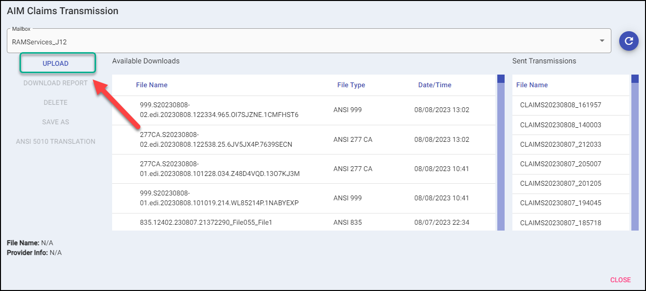 The AIM Claims Transmission Screen handles the uploading and downloading of various claims files.
