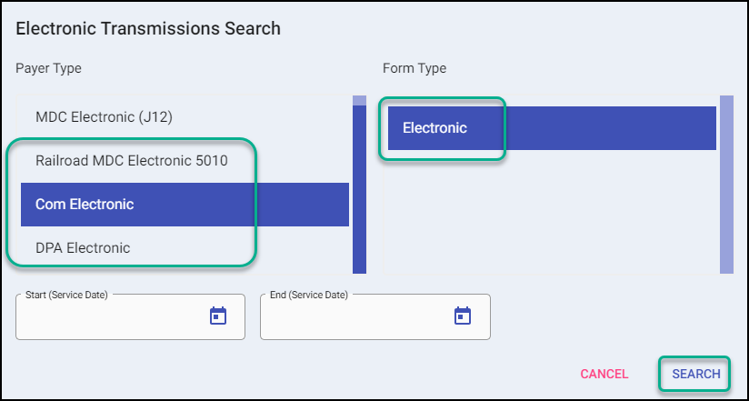 On the search screen, select your Commercial payer and Electronic form type, then search.