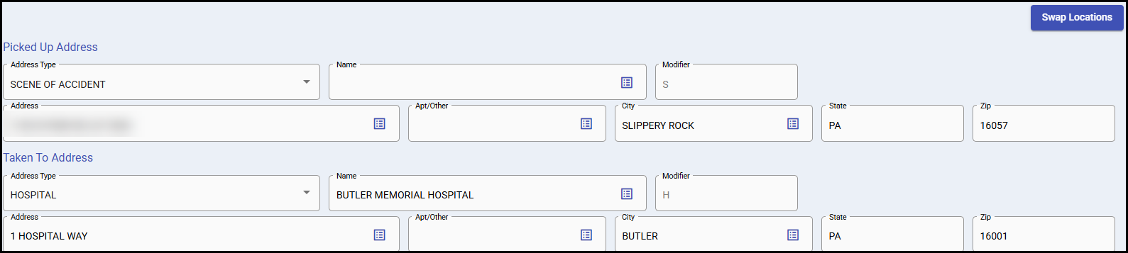 Using the Swap Locations button will reverse the Picked Up and Taken To Addresses, which saves significant time when billing for those types of transports.