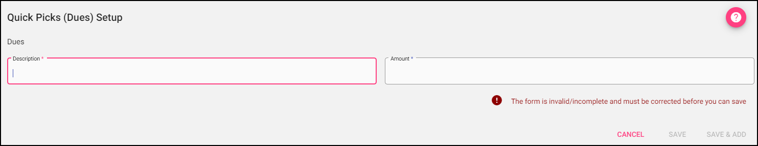- Dues: must be established before Dues are entered. Values should represent the consistent amount, but can be changed. This Quick Pick Type is only used with the Accounts/Subscription Module, Subscription Tab.